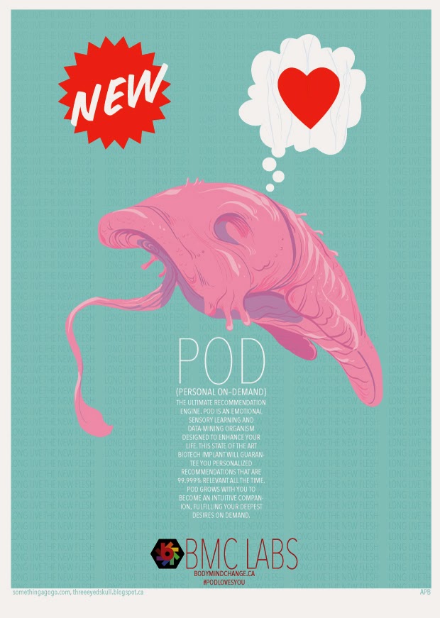 BMC Labs in conjunction with the TIFF's David Cronenberg EVOLUTION exhibit are giving prople the opportunity to test drive some new biotech implant that's designed to enhance your life! check out the BMC website for more details. I just really felt like taking a shot at drawing the POD device.